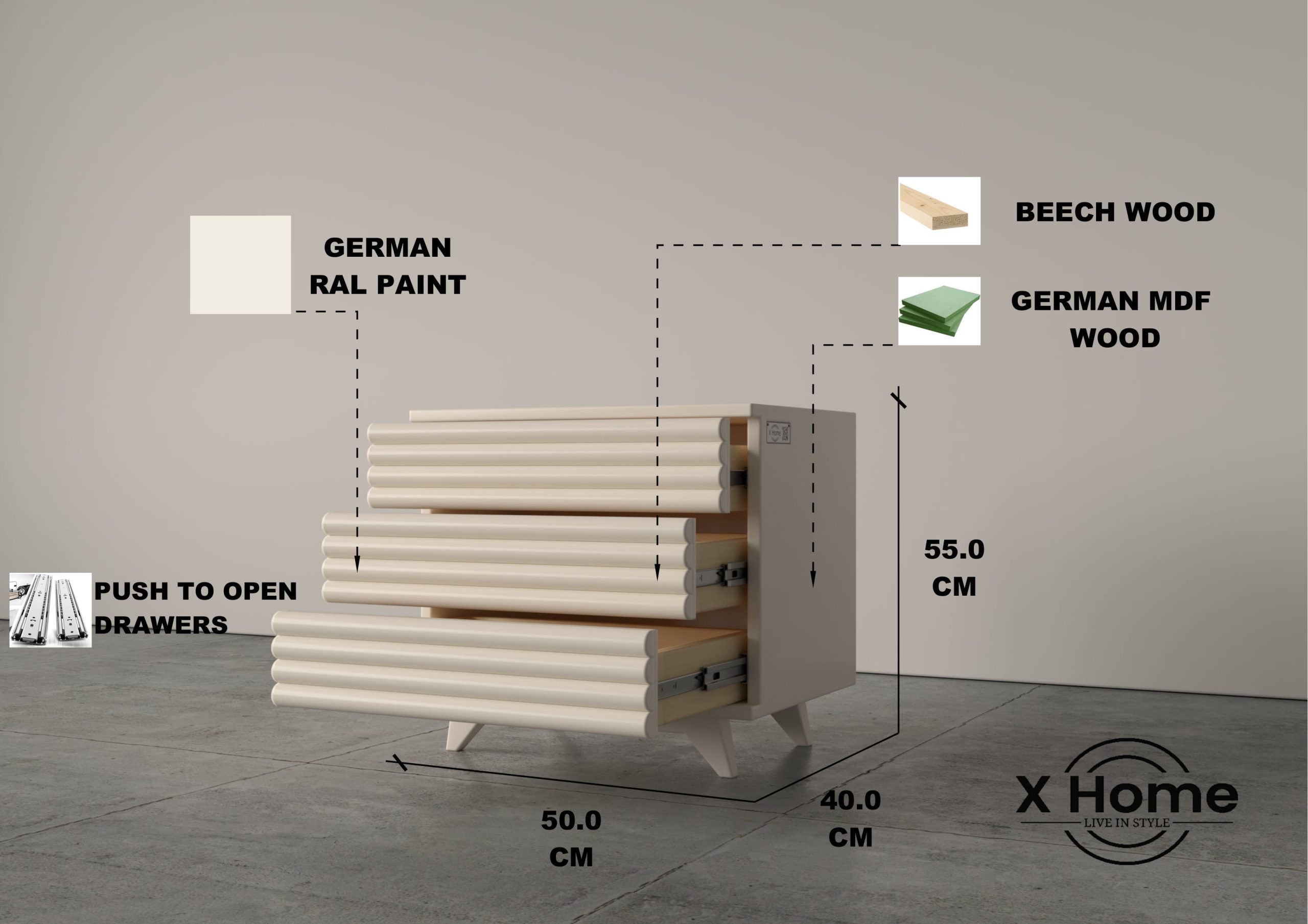 - Beech Wood(Push to open drawers),Melamine MDF Wood inside the drawers,German MDF Wood,German RAL paint.