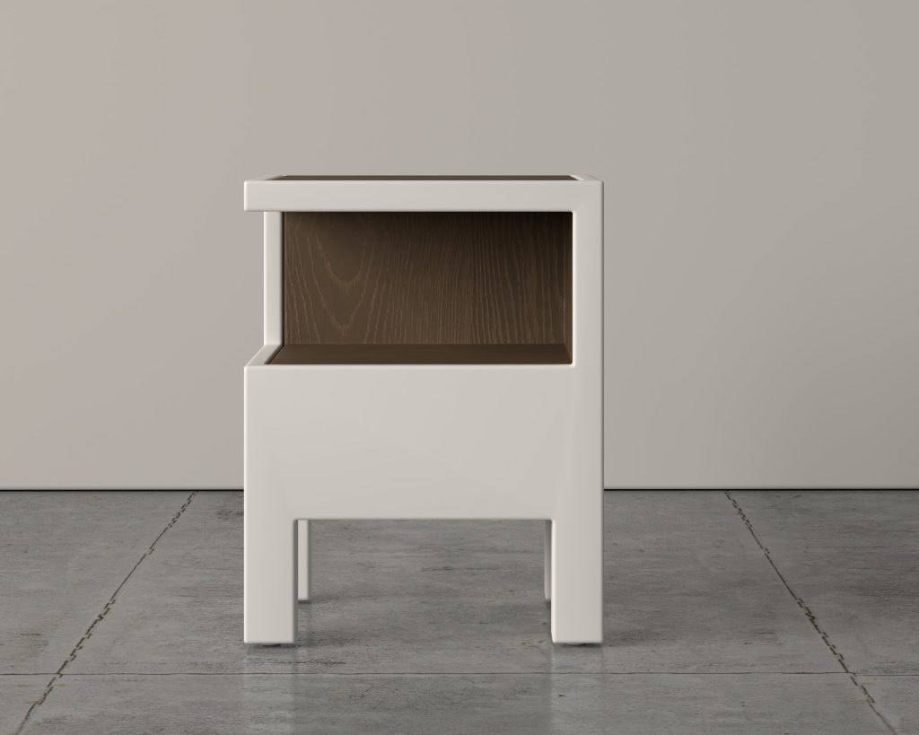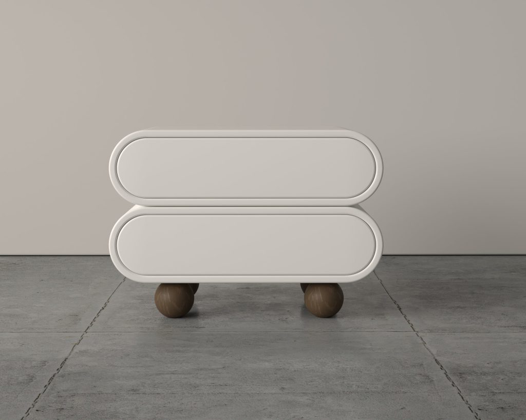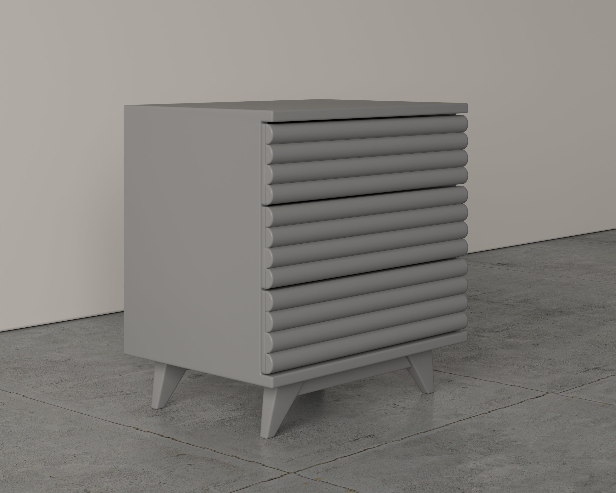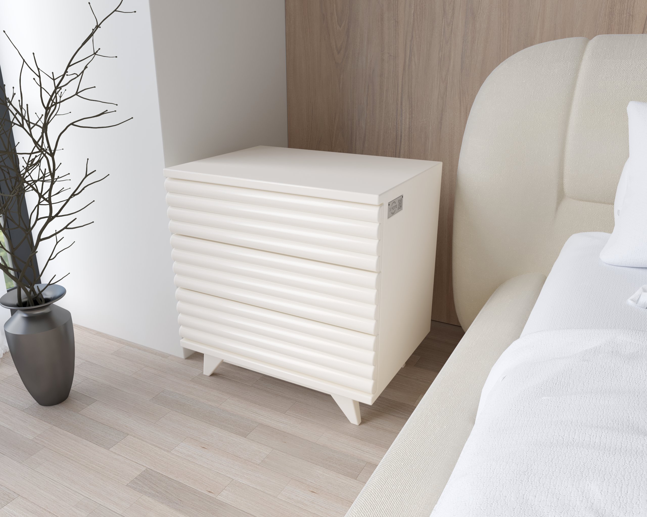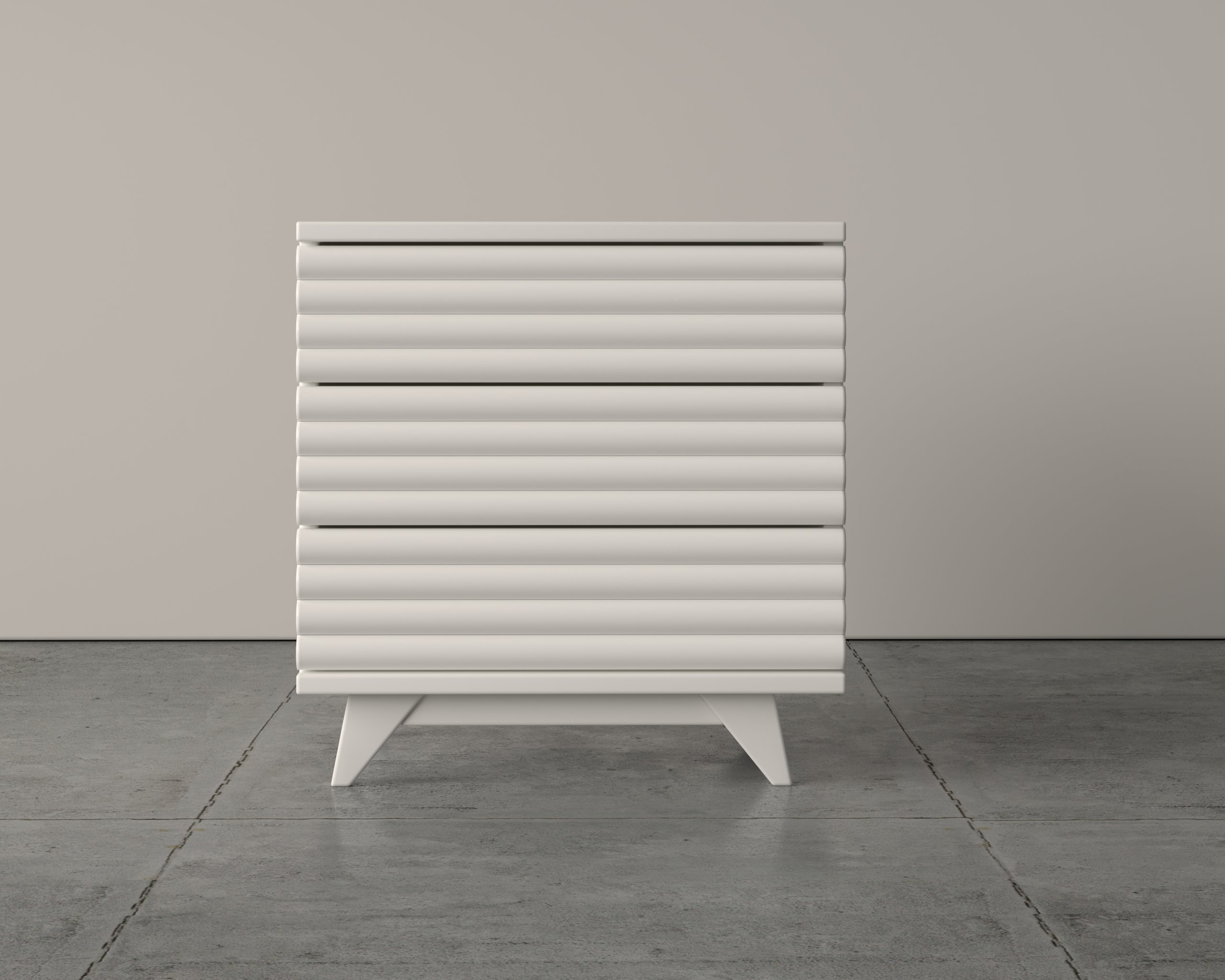 With a curved ribbed front and angled legs, the Serena bedside table adds architectural interest to serene bedroom spaces.