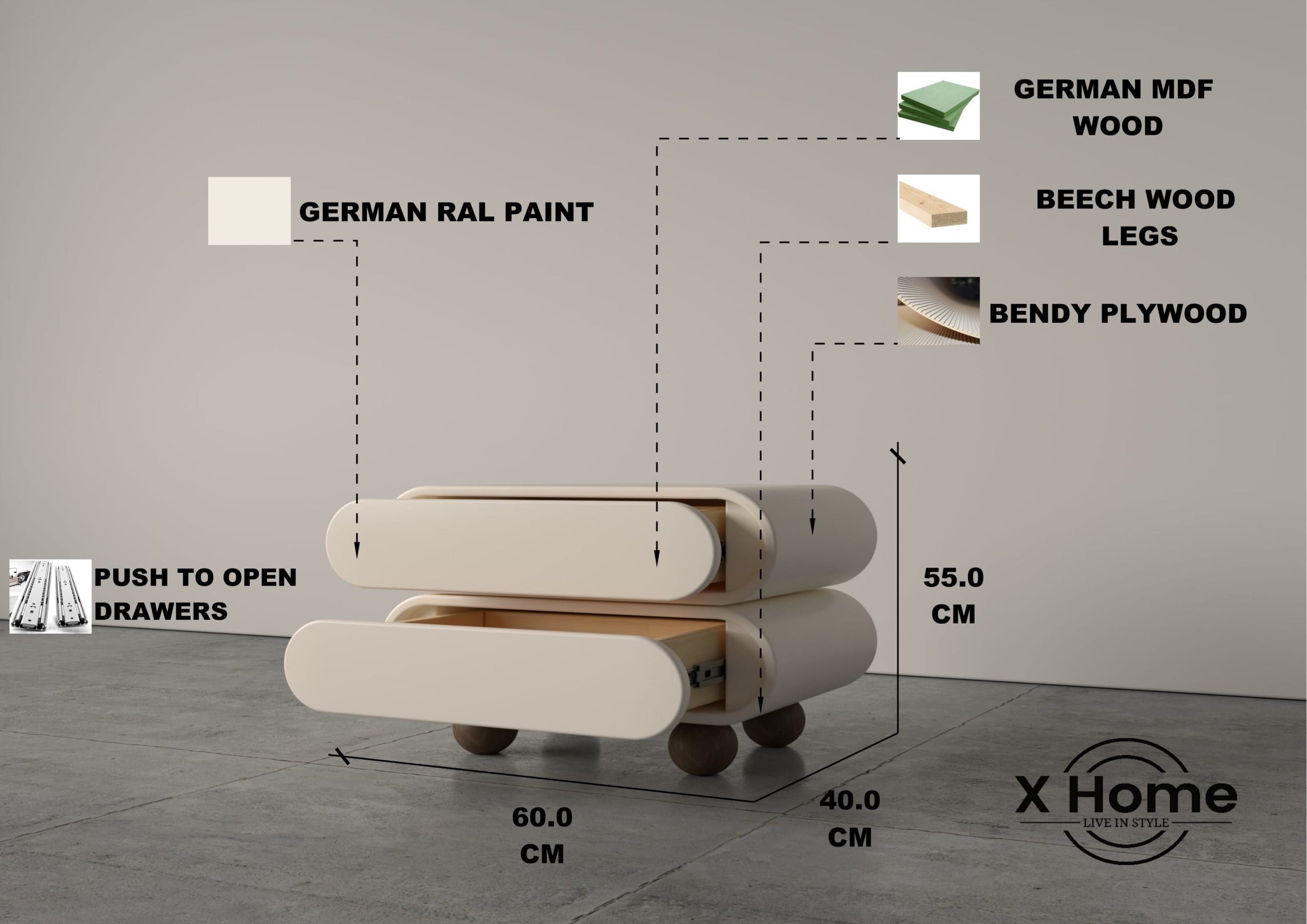 - German MDF Wood(Push to open drawers)& Bendy playwood,Melamine MDF Wood inside the drawers,Beech wood legs, German RAL paint