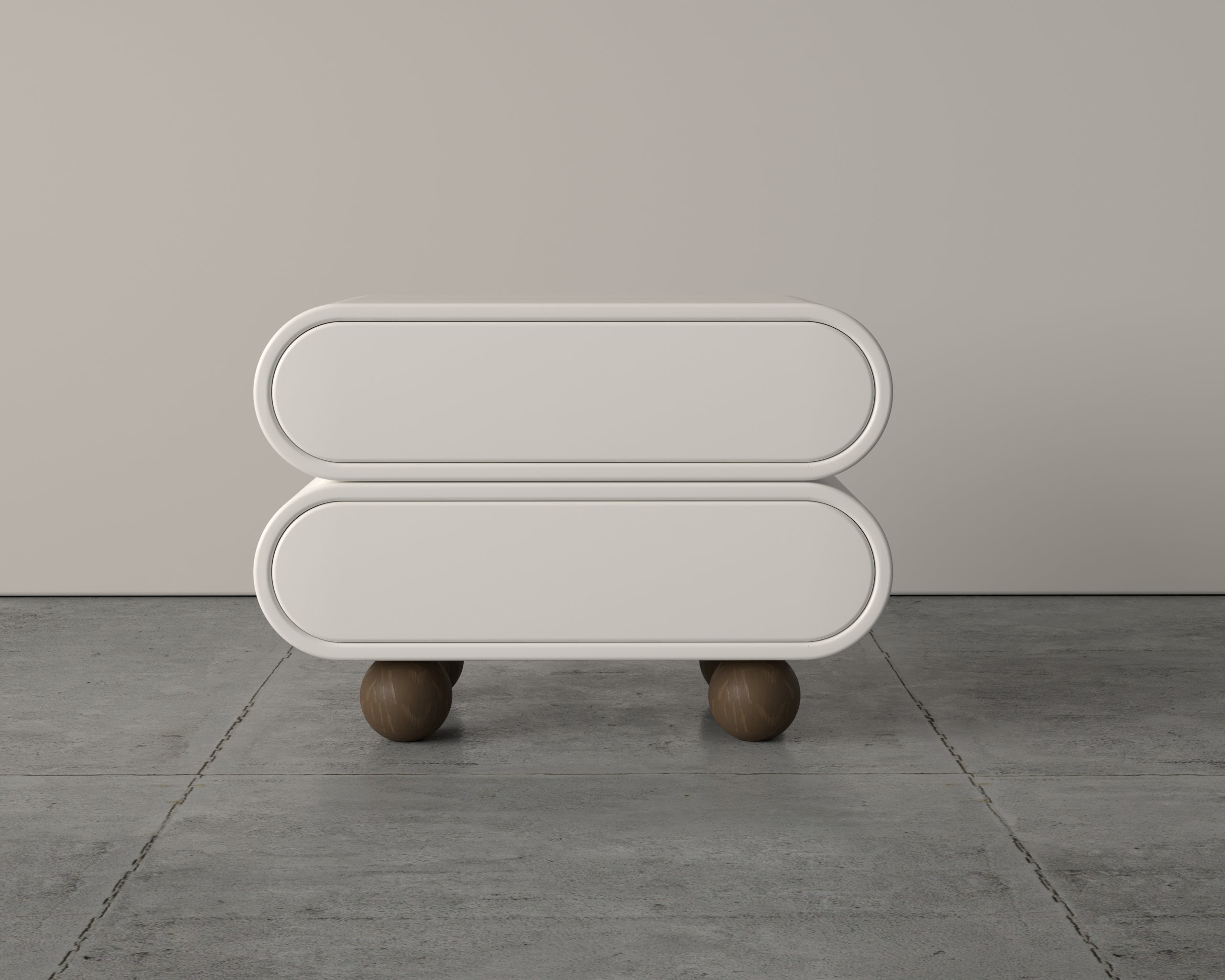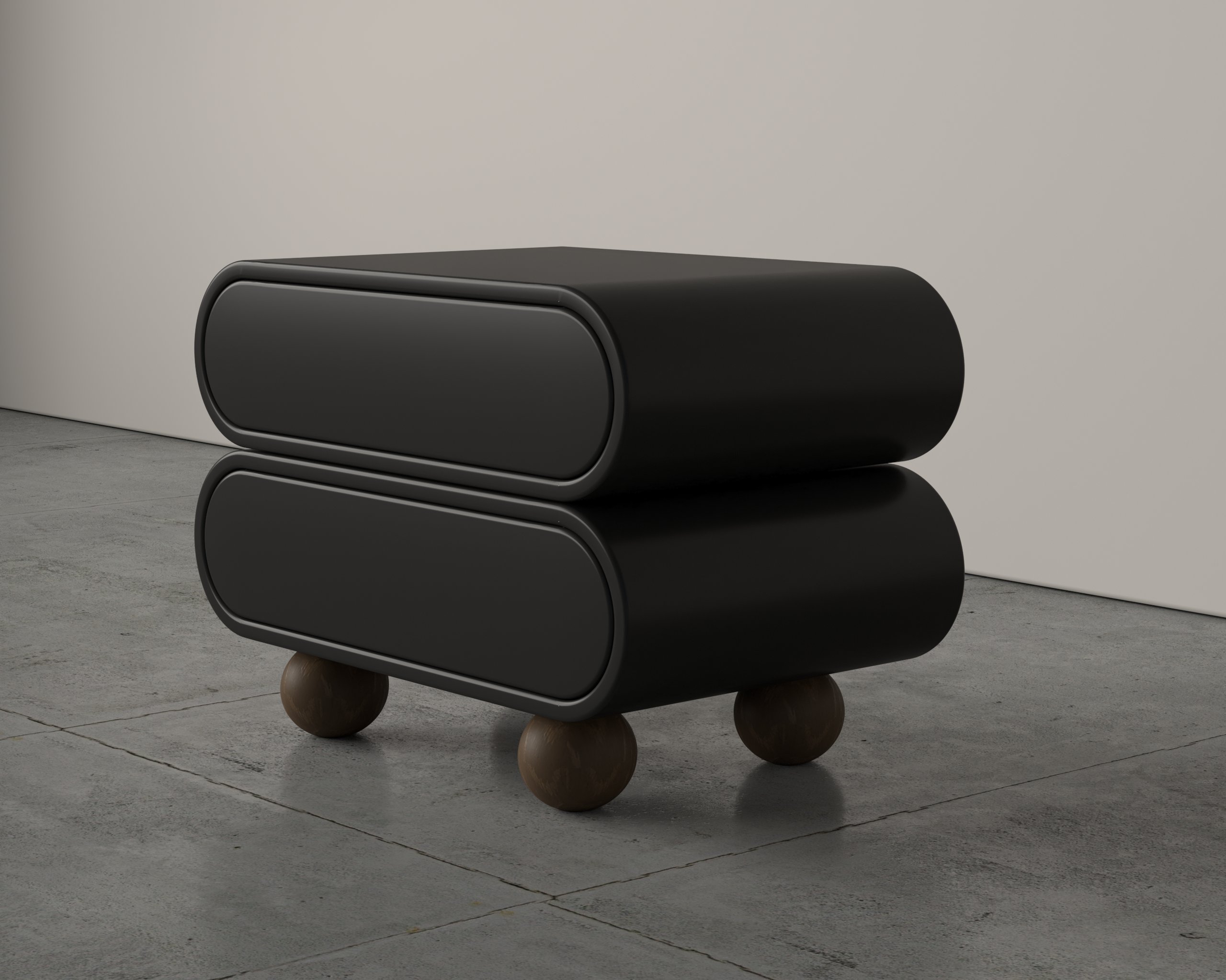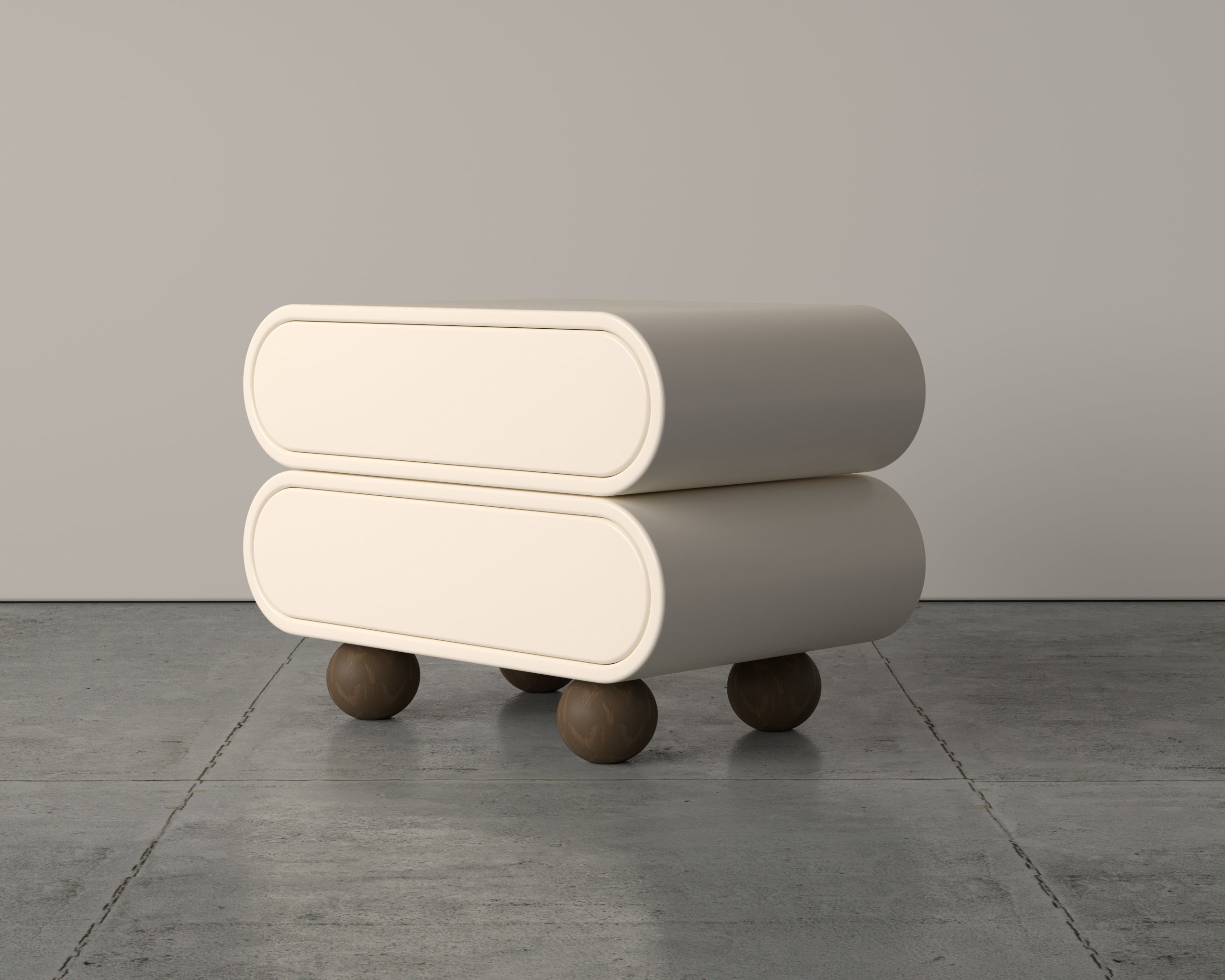 Sleek and modern minimalist design with smooth, rounded edges. Dual storage compartments for practical and organized use. Spherical leg base for stability and a unique, sculptural look. Compact and functional form, ideal for contemporary interiors.