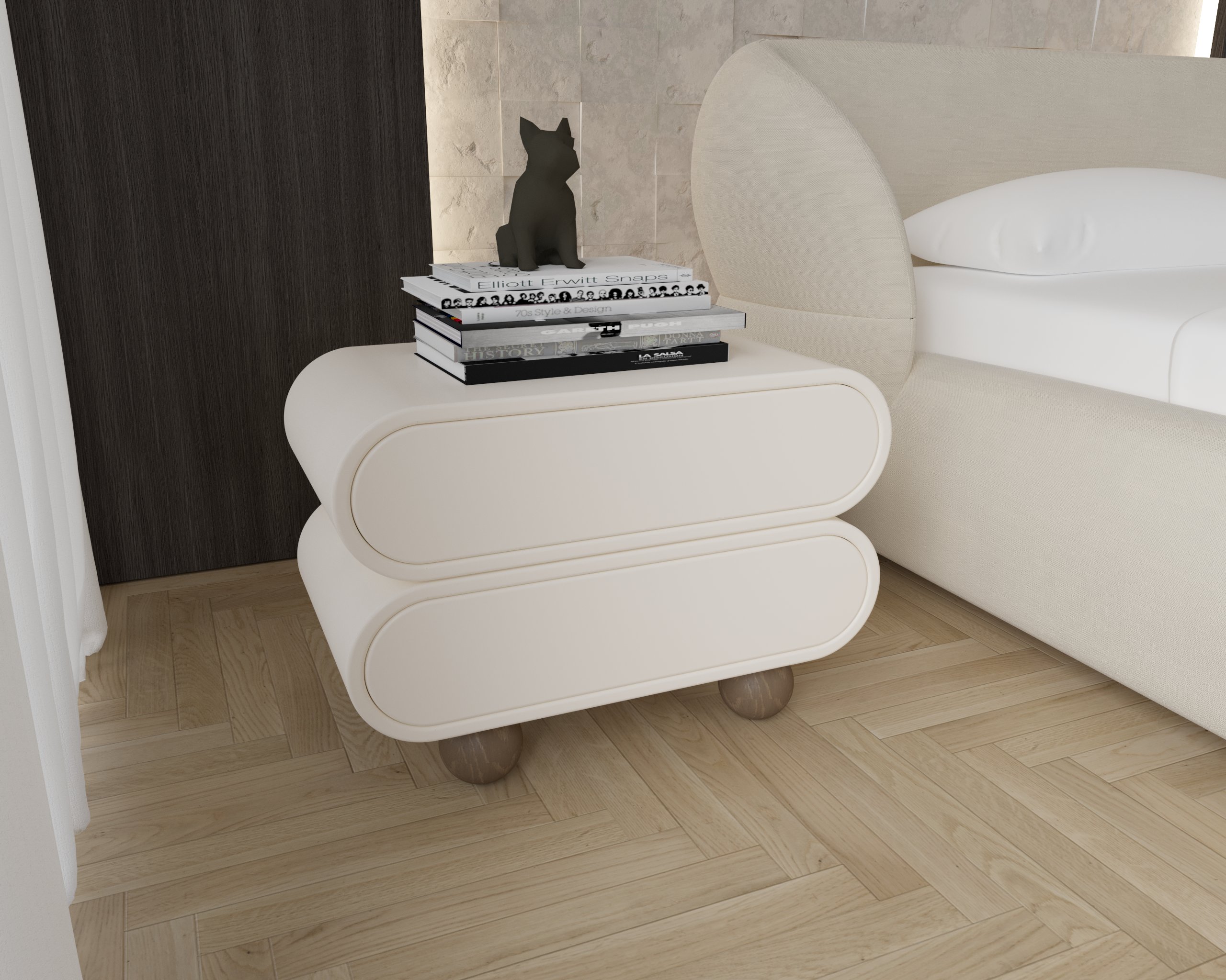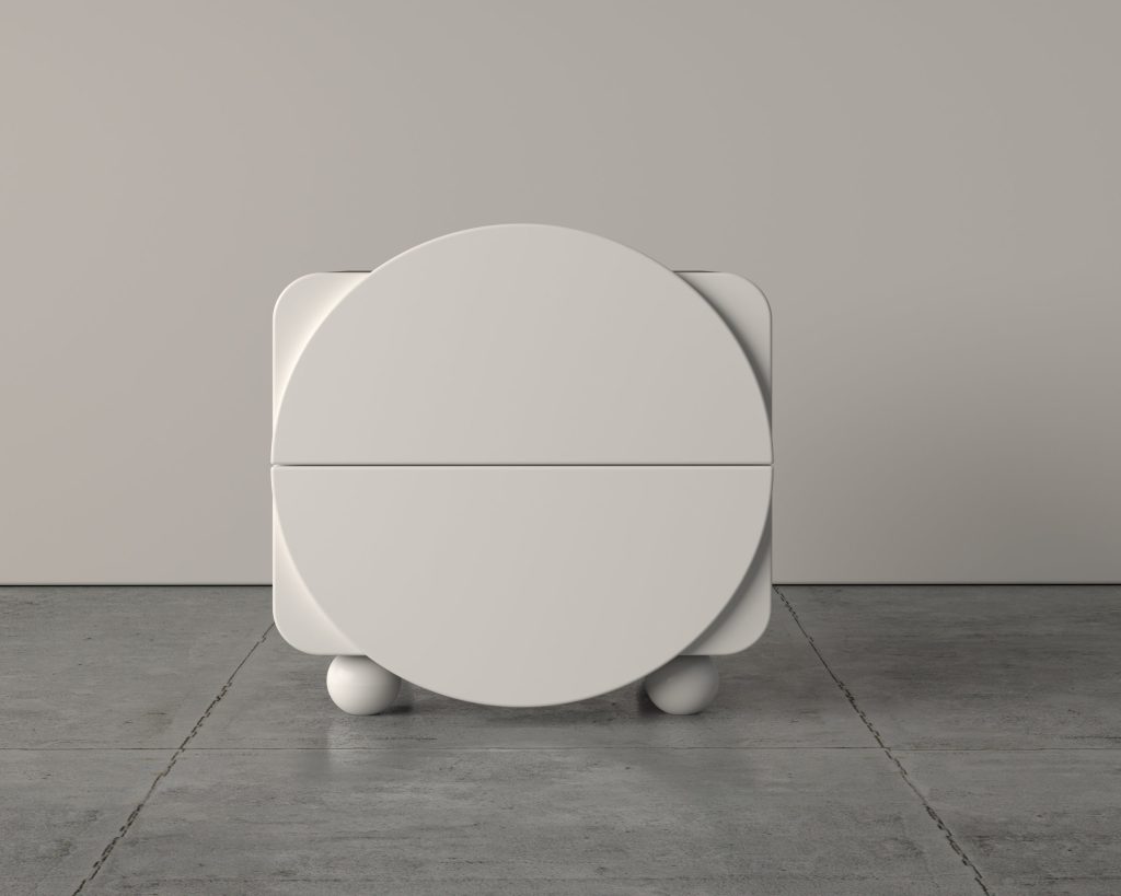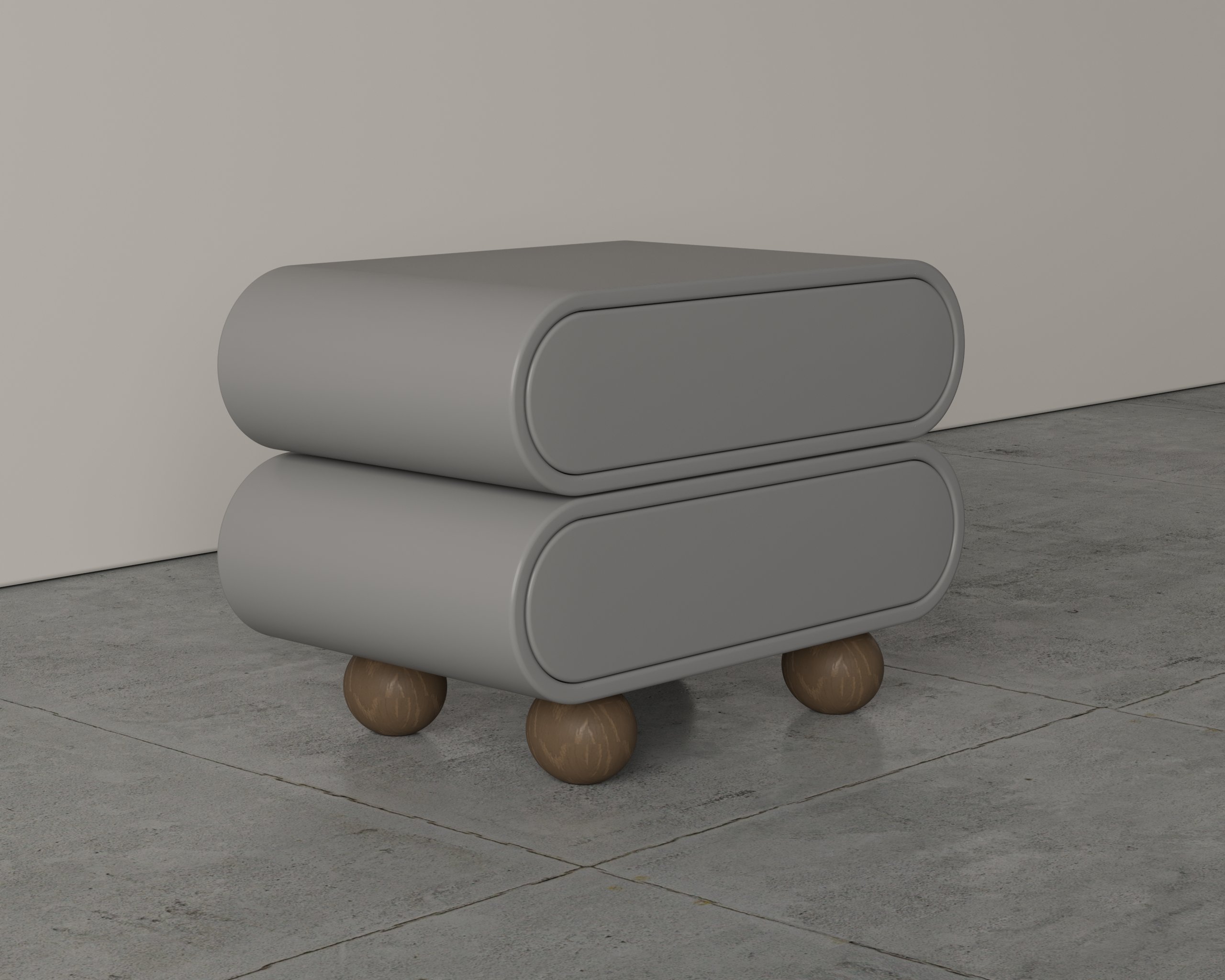 Sleek and modern minimalist design with smooth, rounded edges. Dual storage compartments for practical and organized use. Spherical leg base for stability and a unique, sculptural look. Compact and functional form, ideal for contemporary interiors.