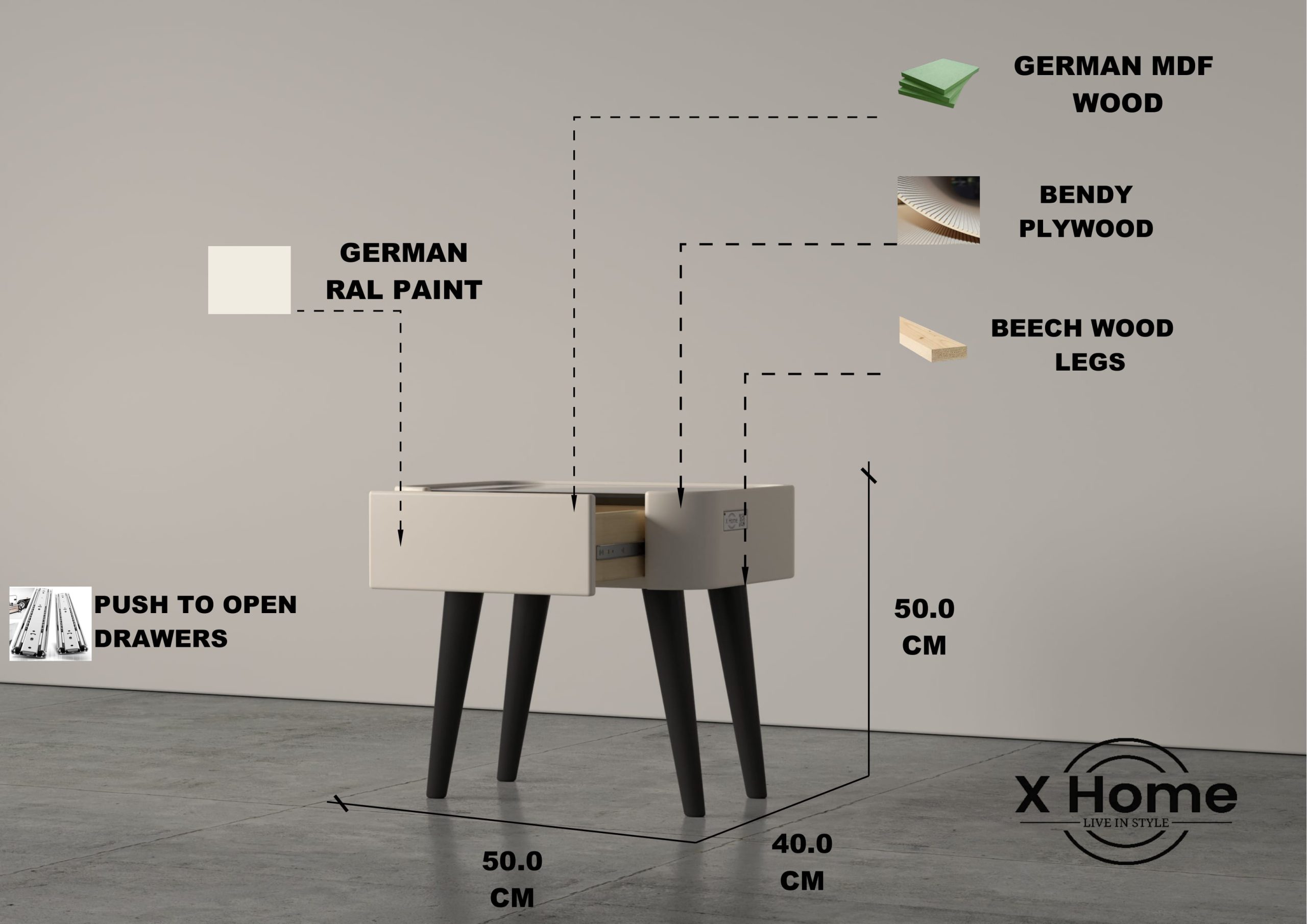 - German MDF Wood(Push open drawers),Melamine MDF Wood inside the drawers,Beech Wood legs,Bendy plywood, German RAL paint