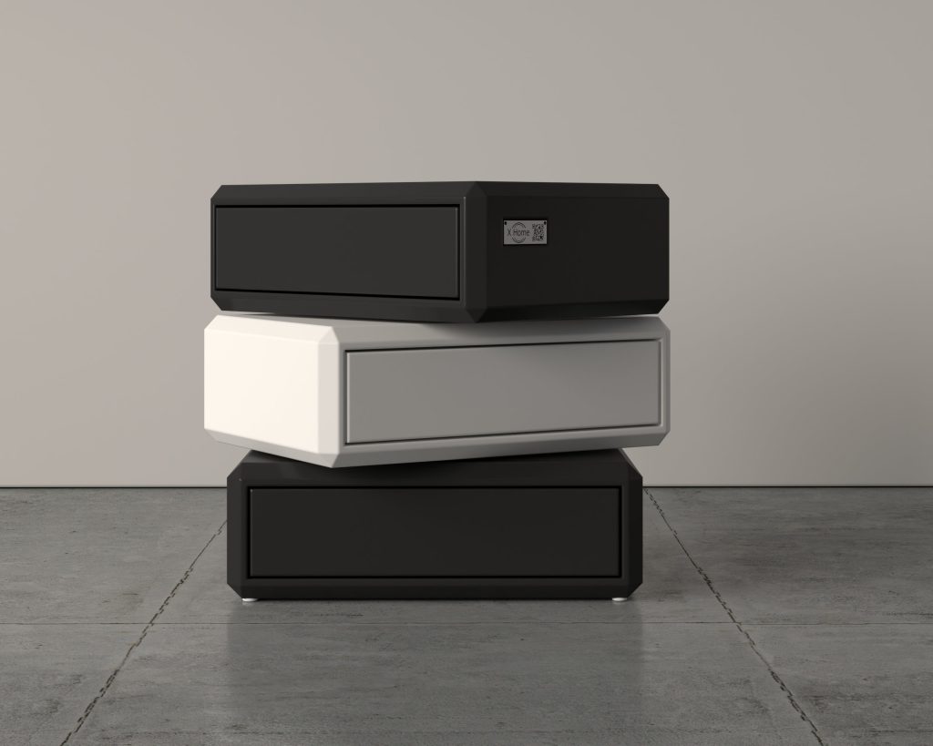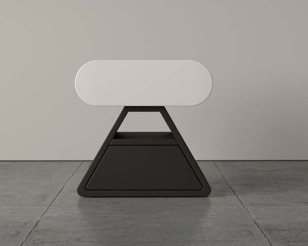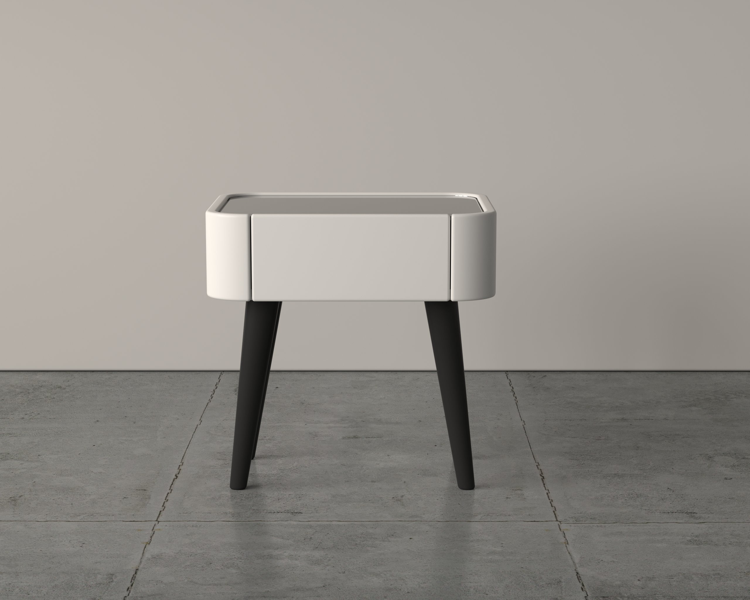 The Stella Bedside Table is a playful blend of retro and modern. Its soft-edged beige frame surrounds a deep black top, resting on four angled black tapered legs for a touch of mid-century nostalgia. The design is simple yet stylish, making it a versatile companion for both minimal and vintage-inspired interiors. Whether styled as a nightstand or side table, Stella adds subtle elegance with just the right personality.