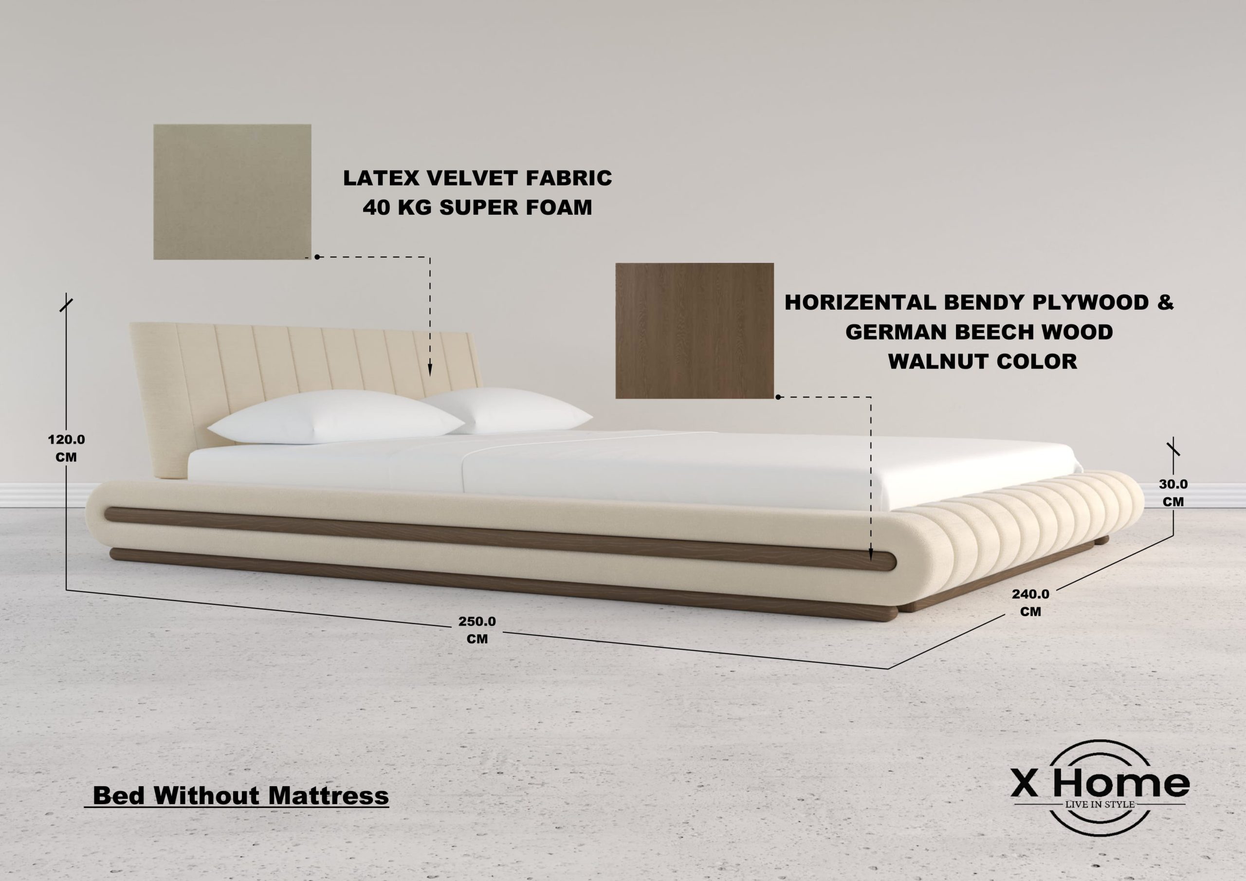 250 cm (W) x 240 cm (D) x 120 cm (H) (Headboard)