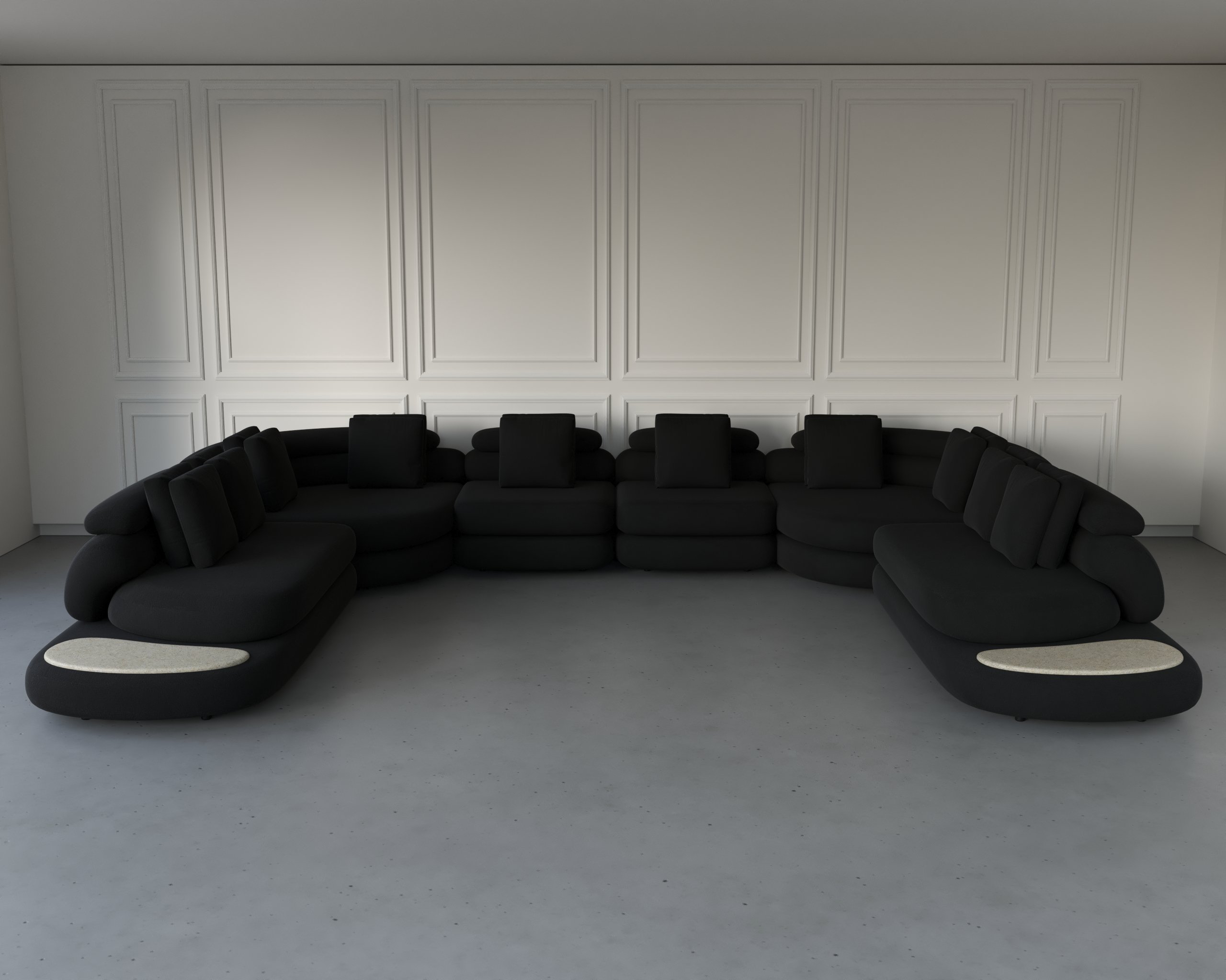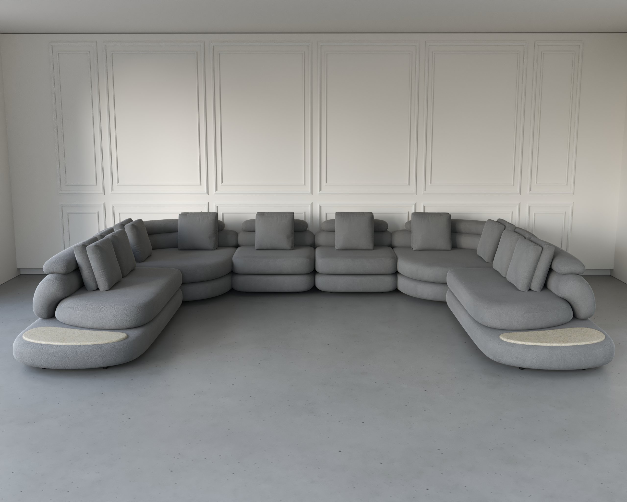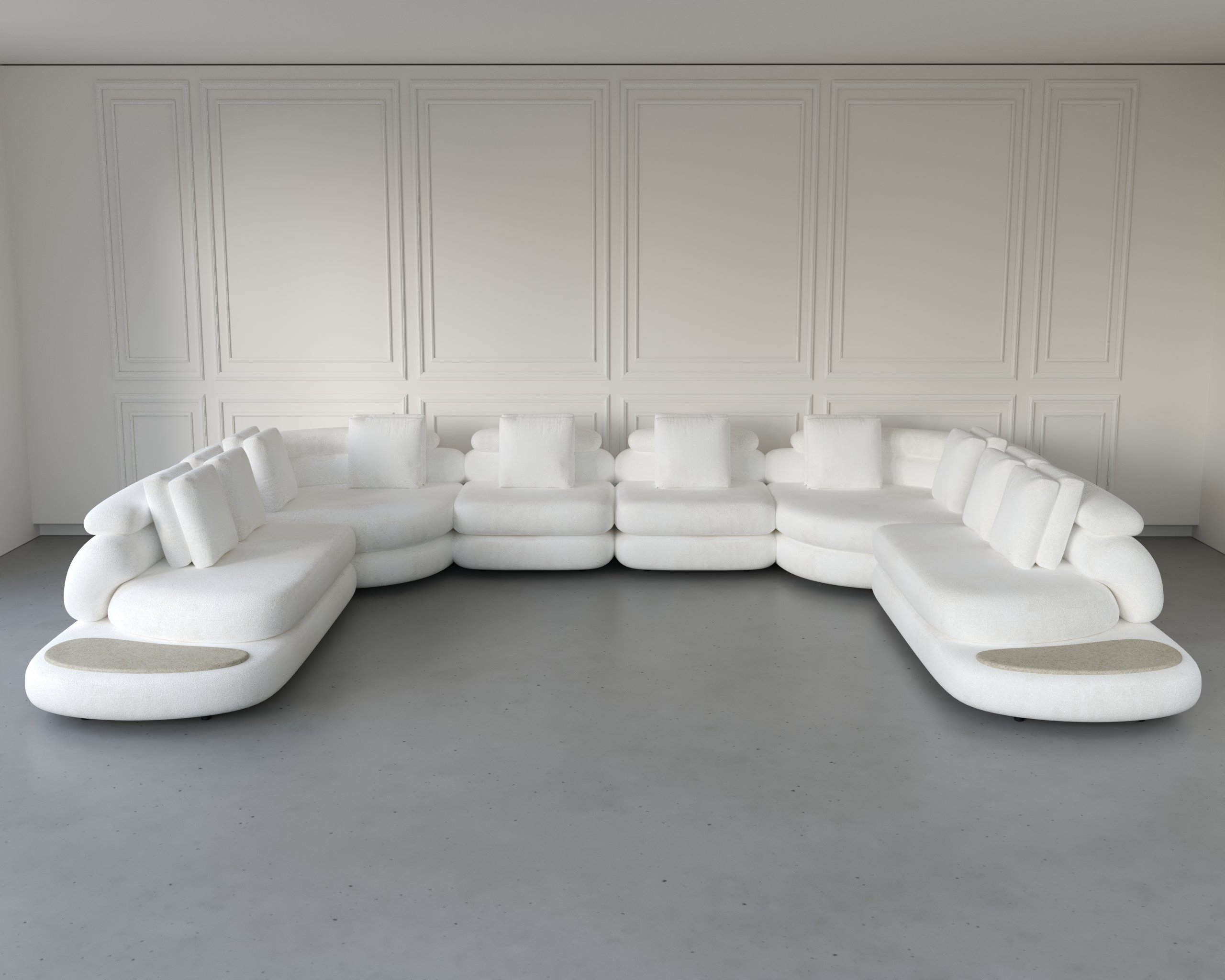 A luxurious U-shaped sectional sofa with sculpted contours, plush cushions, and integrated upholstered coffee tables on both ends — combining modern elegance, functionality, and supreme comfort.