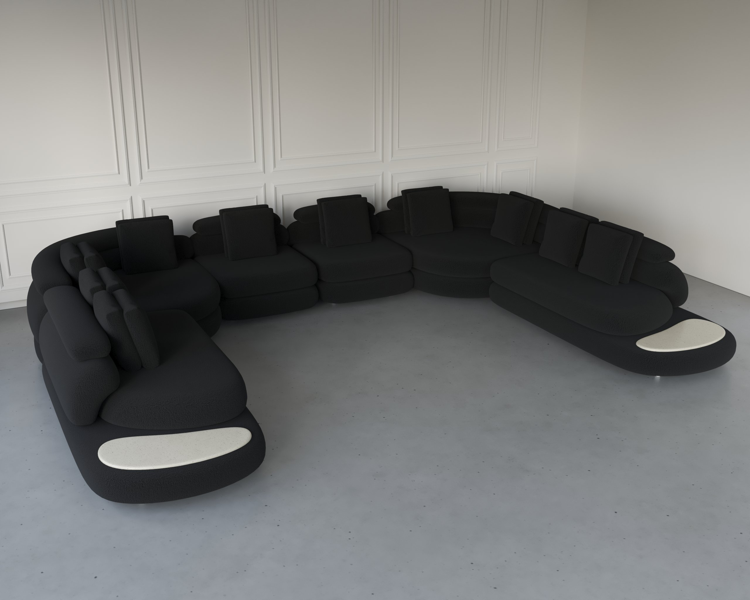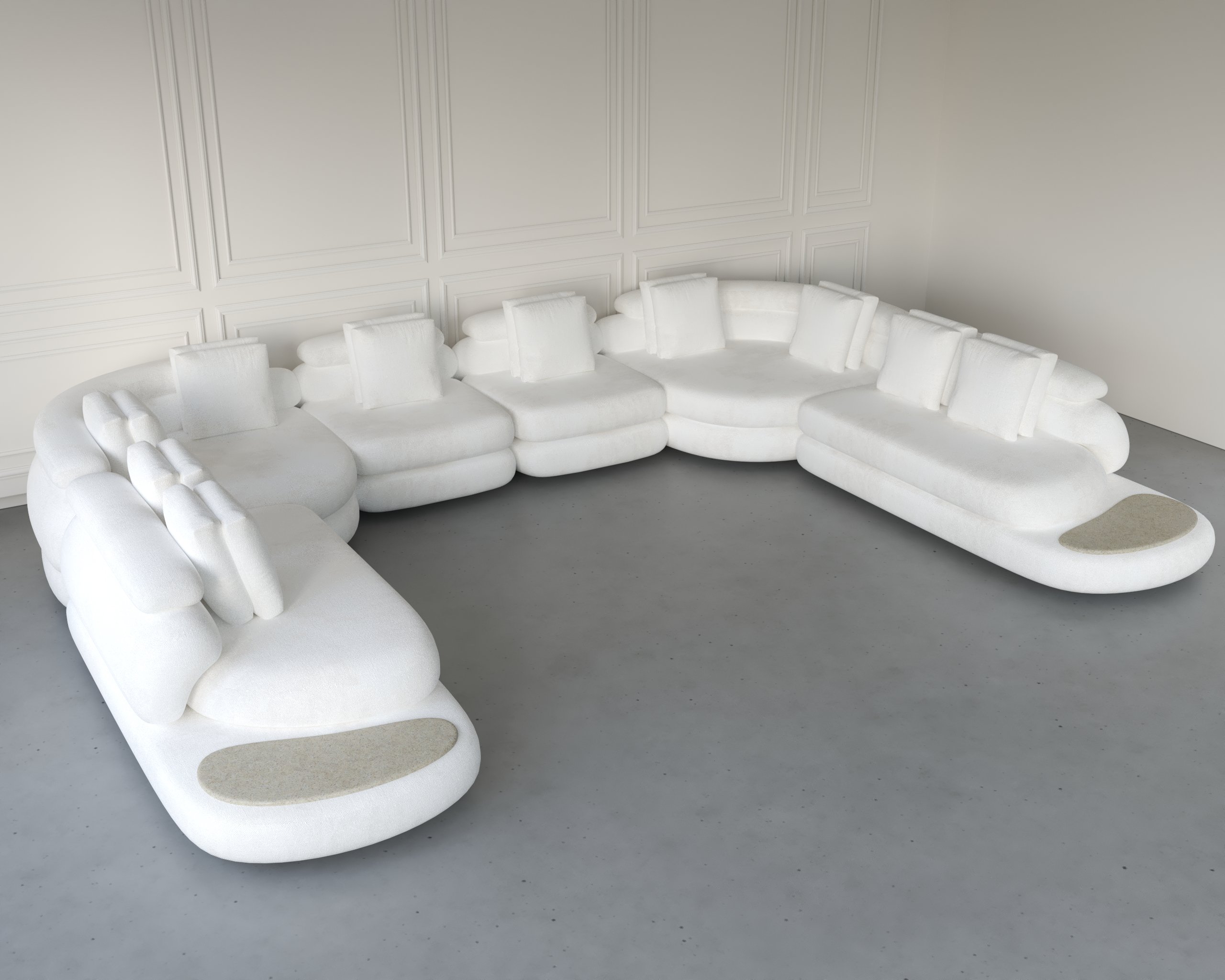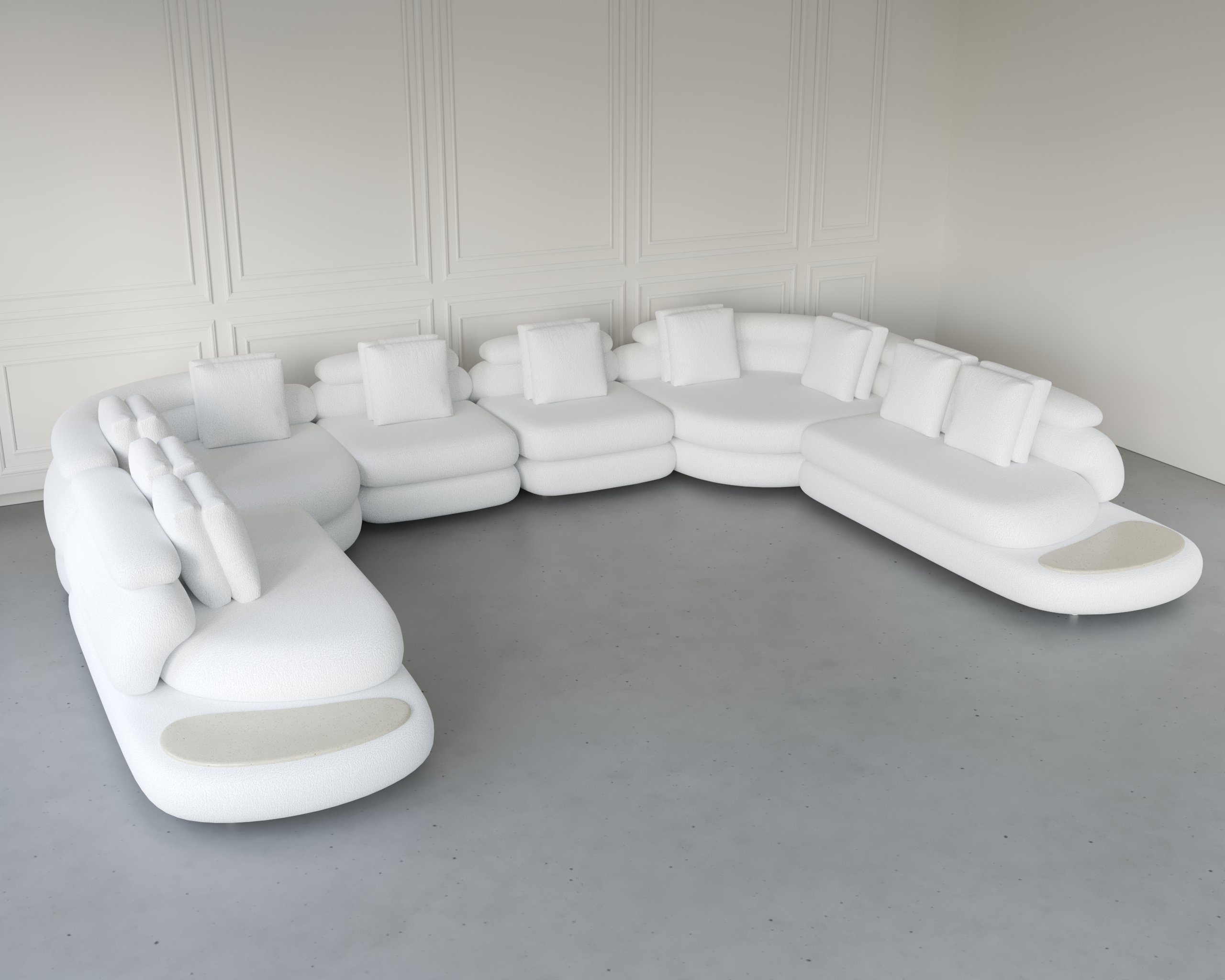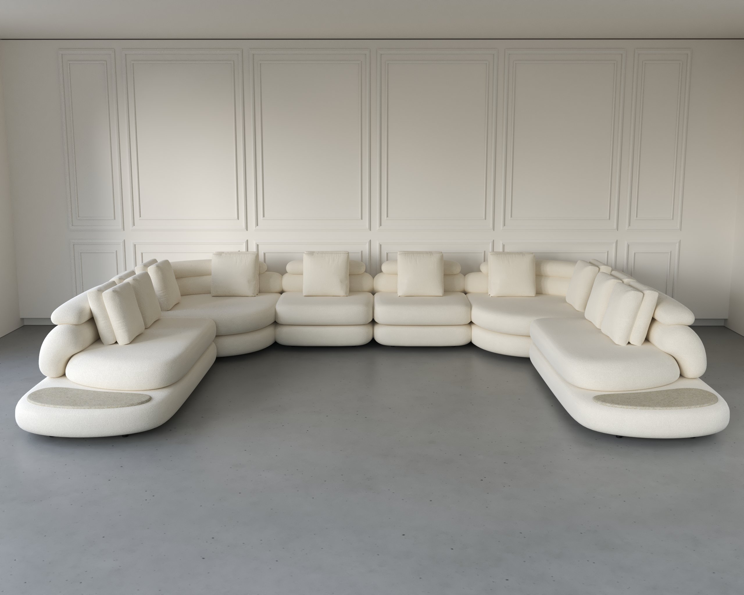 At each end, the sofa is equipped with integrated upholstered coffee tables, subtly built into the frame for a cohesive and sculptural aesthetic. These built-in surfaces provide convenient spots for beverages, books, or decorative objects, while maintaining the elegant flow of the design. This thoughtful dual-table integration elevates the piece from a simple seating solution to a multifunctional centerpiece of modern living.”