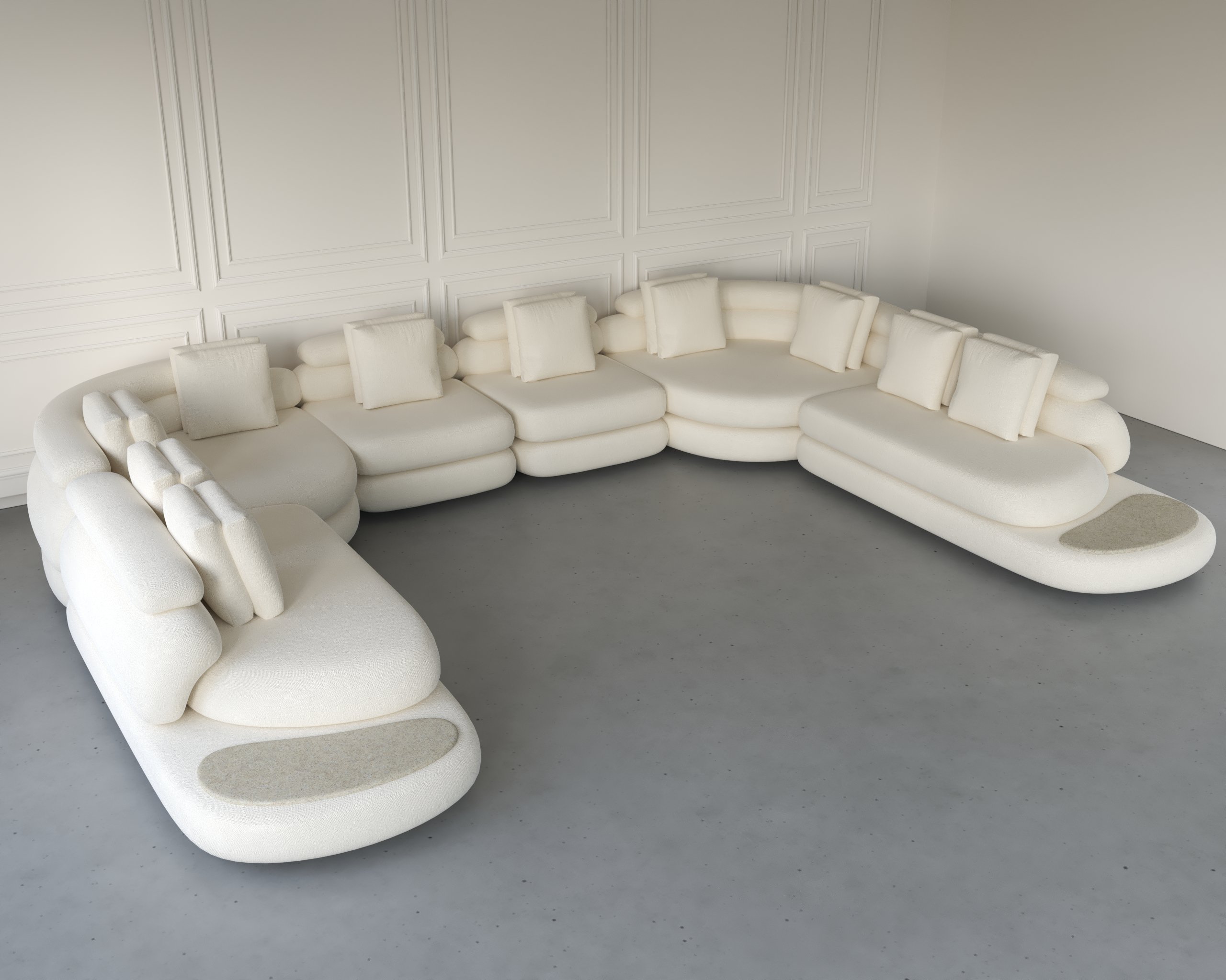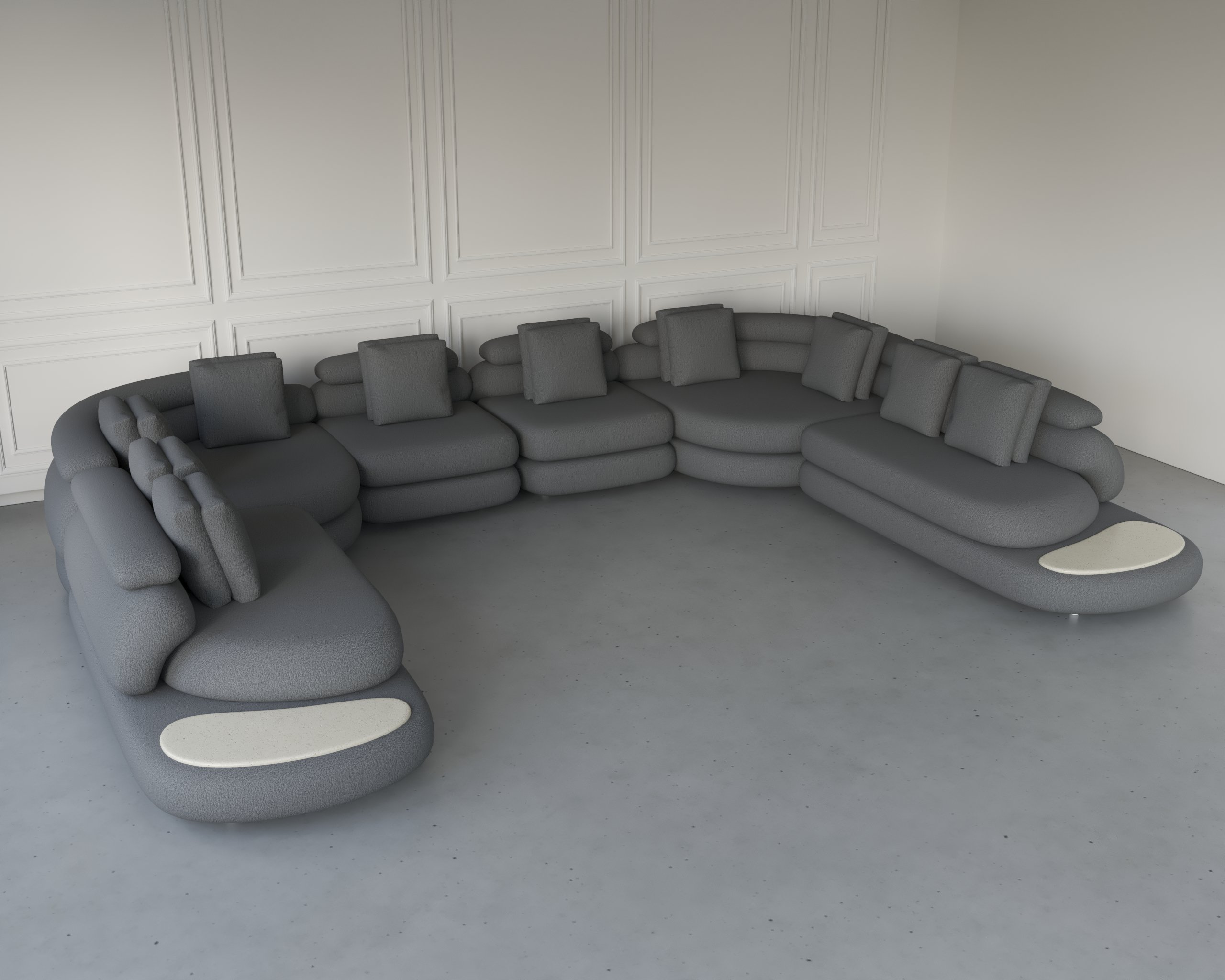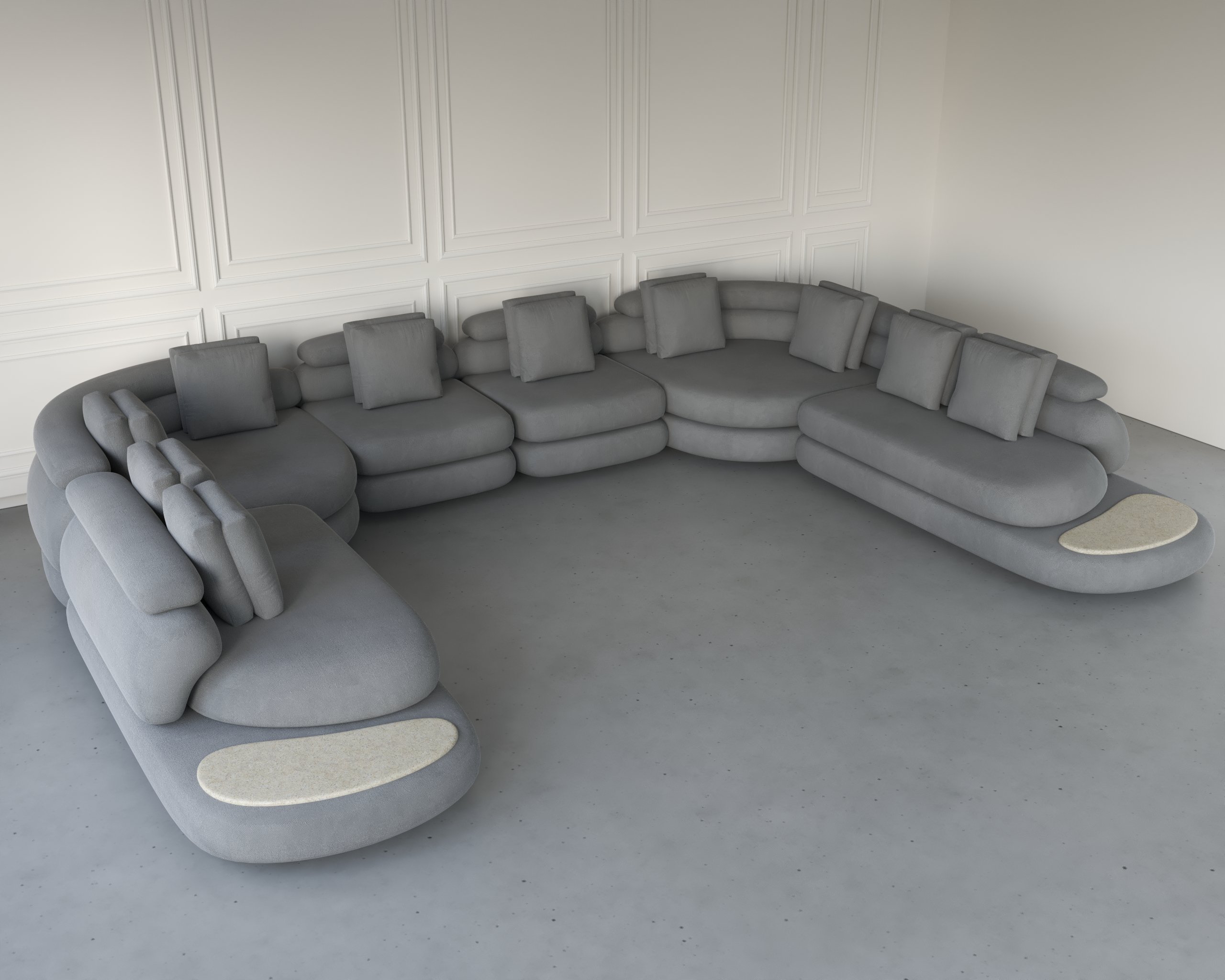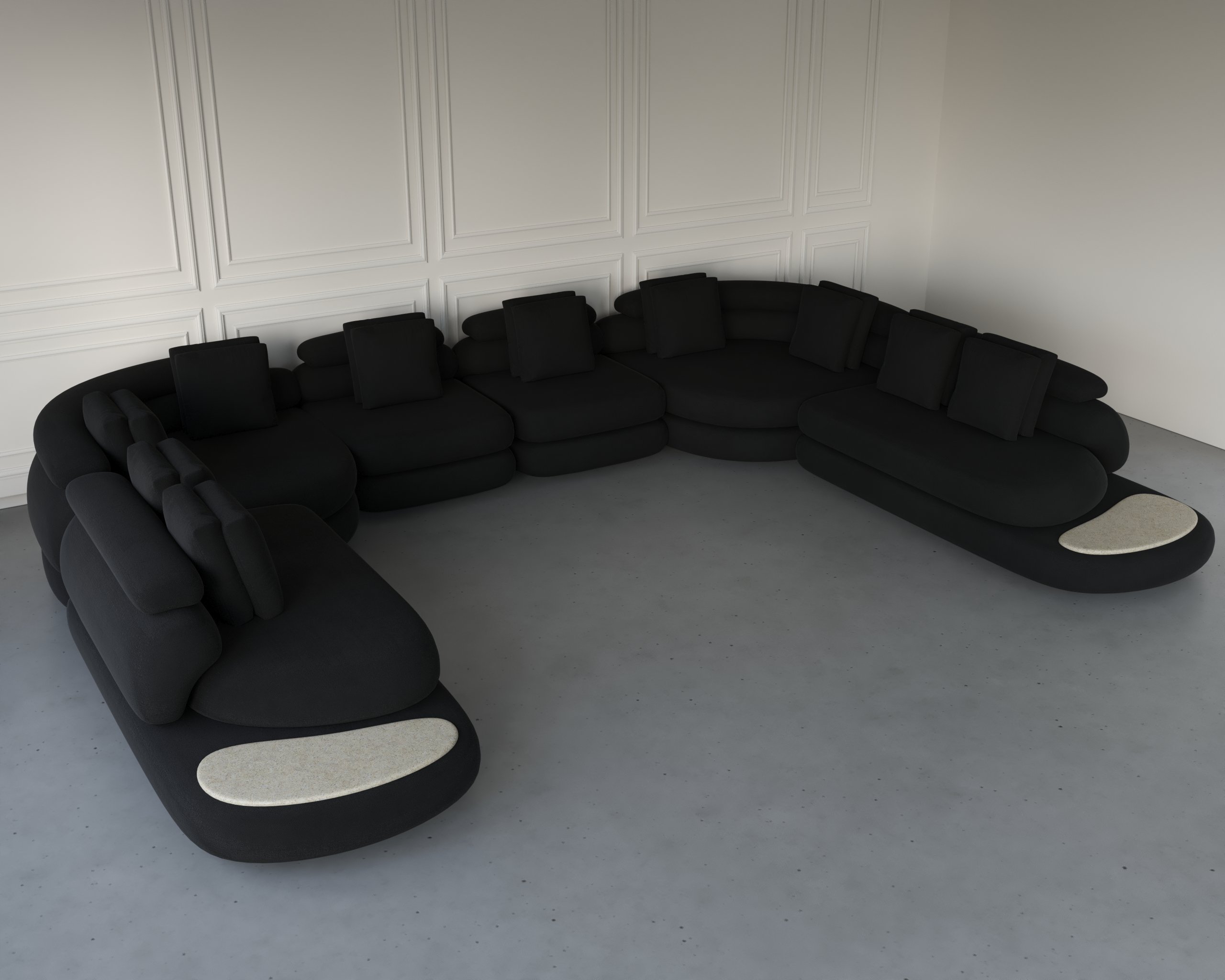 At each end, the sofa is equipped with integrated upholstered coffee tables, subtly built into the frame for a cohesive and sculptural aesthetic. These built-in surfaces provide convenient spots for beverages, books, or decorative objects, while maintaining the elegant flow of the design. This thoughtful dual-table integration elevates the piece from a simple seating solution to a multifunctional centerpiece of modern living.”