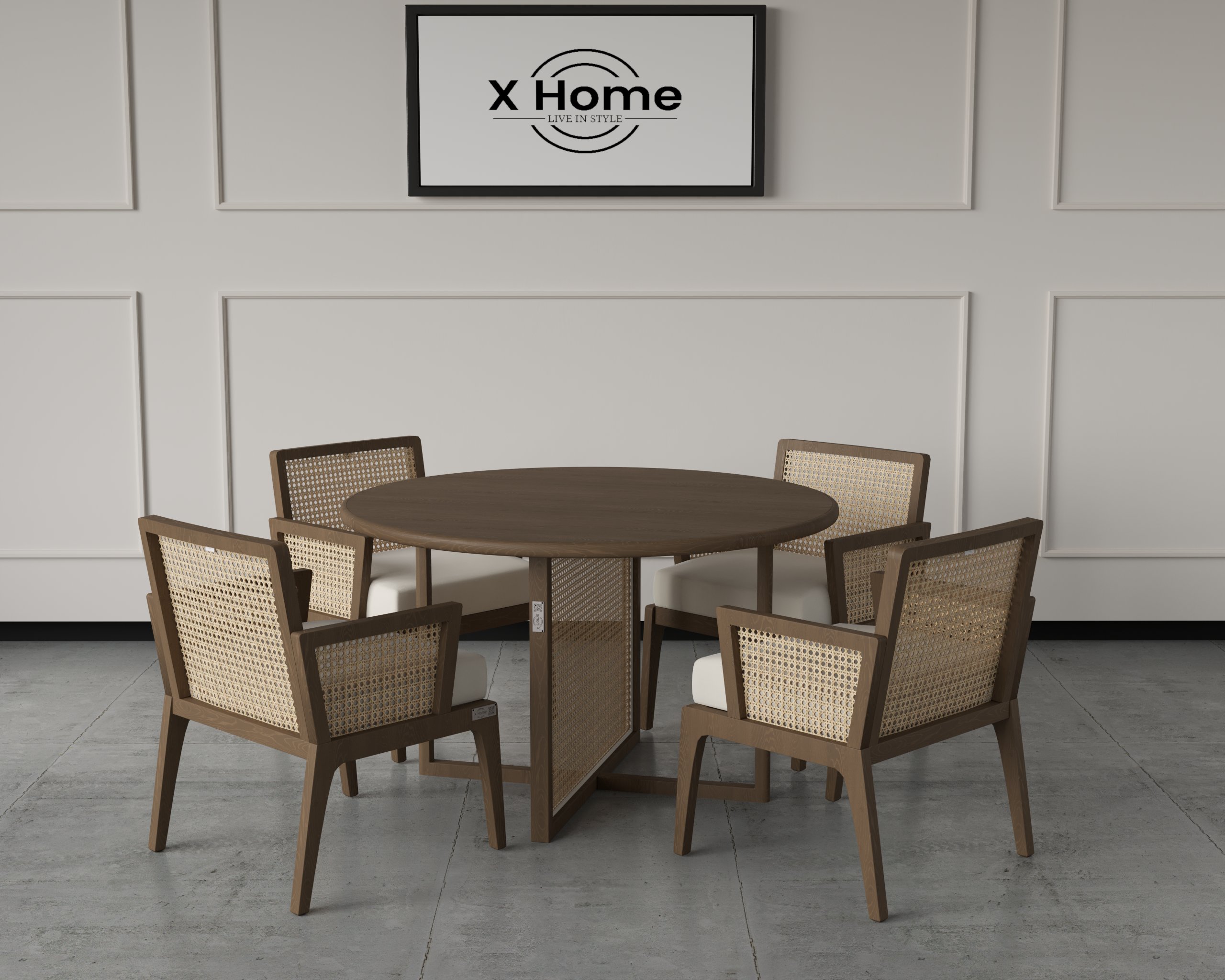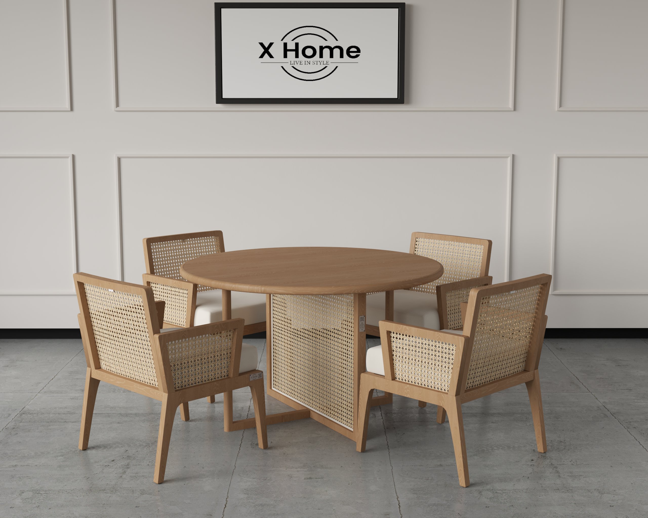The Willow Rattan Dining Set features a round wooden table paired with handcrafted rattan-backed chairs, offering a perfect harmony of texture, craftsmanship, and comfort. Its breathable woven panels and cushioned seating elevate everyday dining. Designed to bring organic warmth and contemporary elegance to any space.