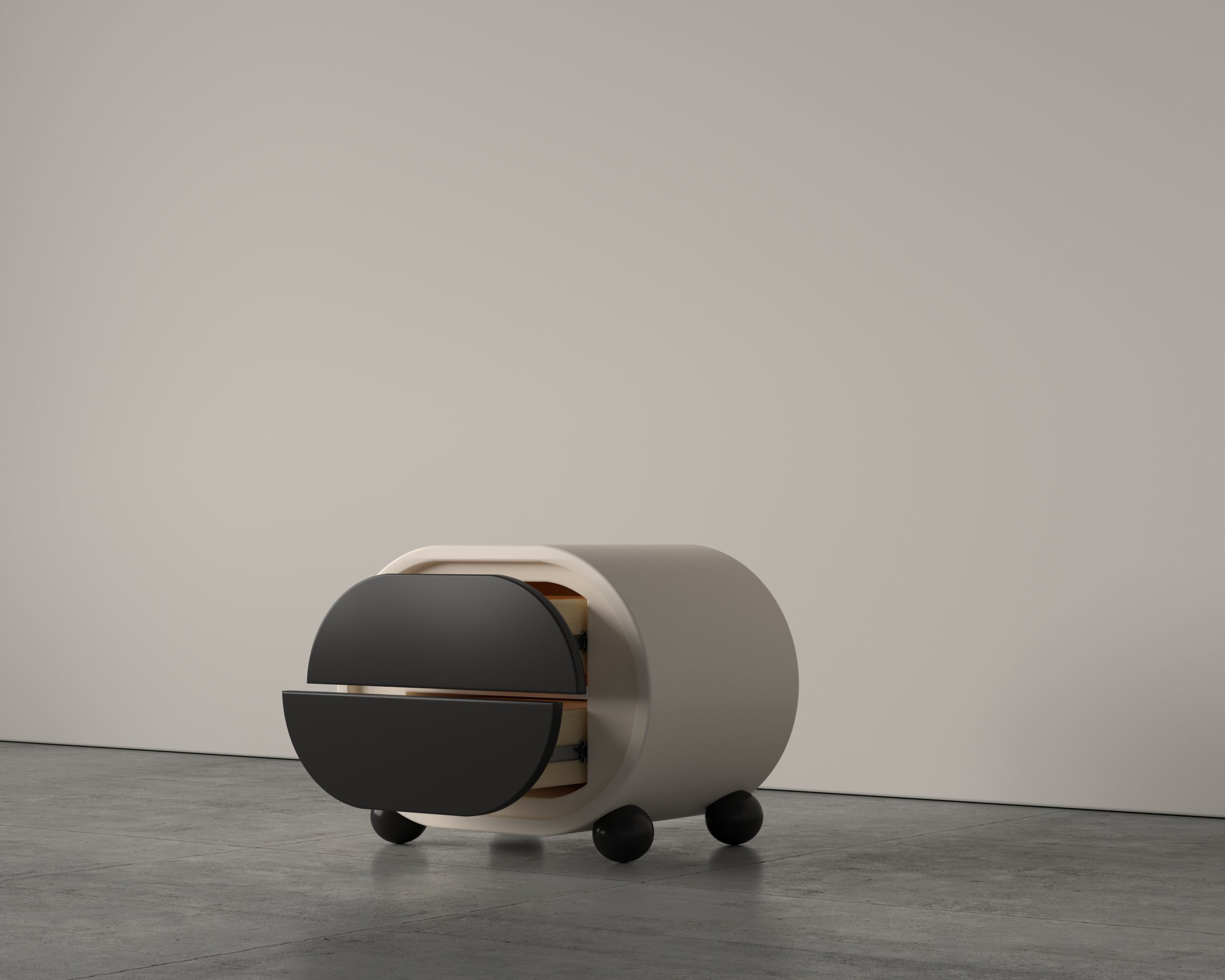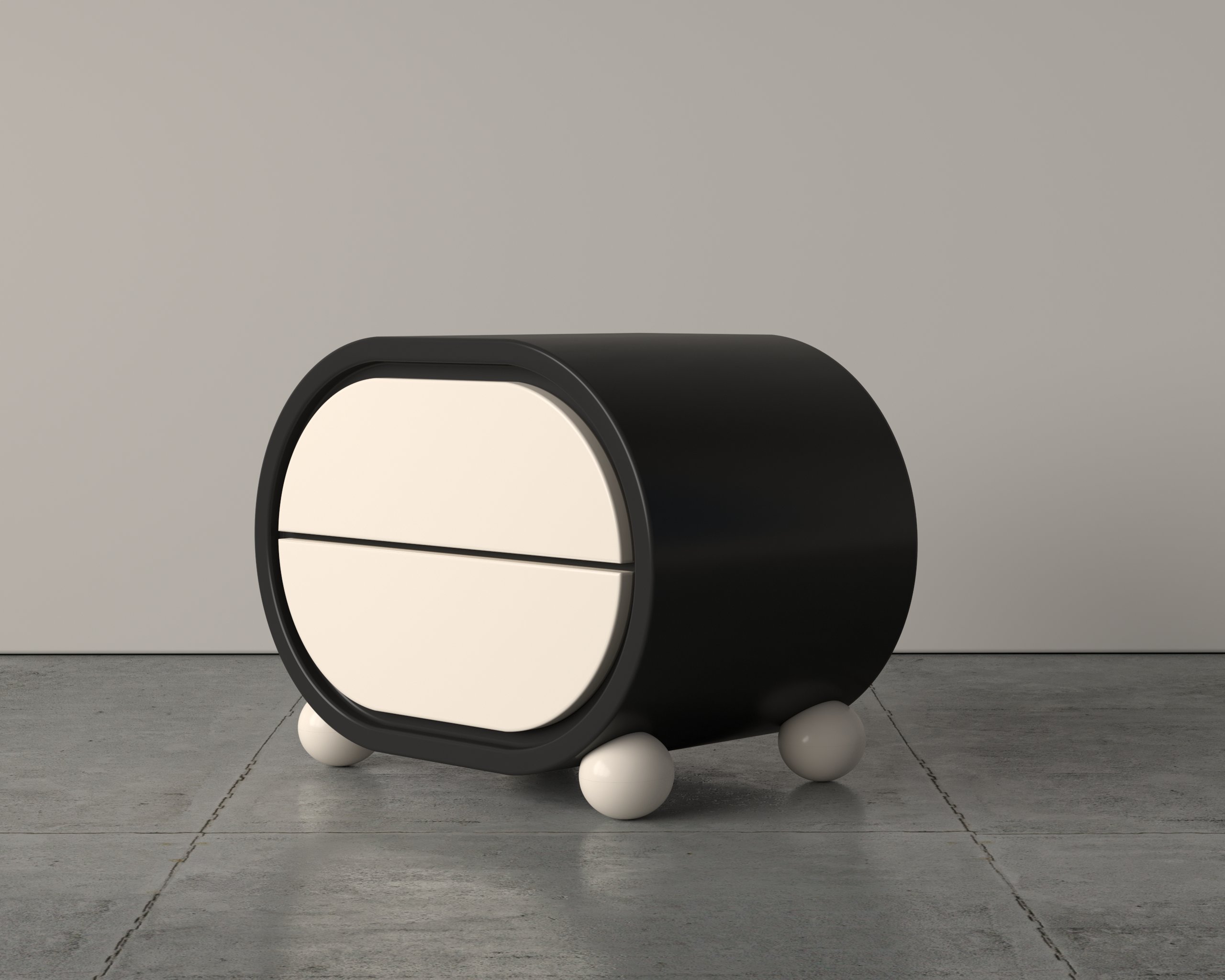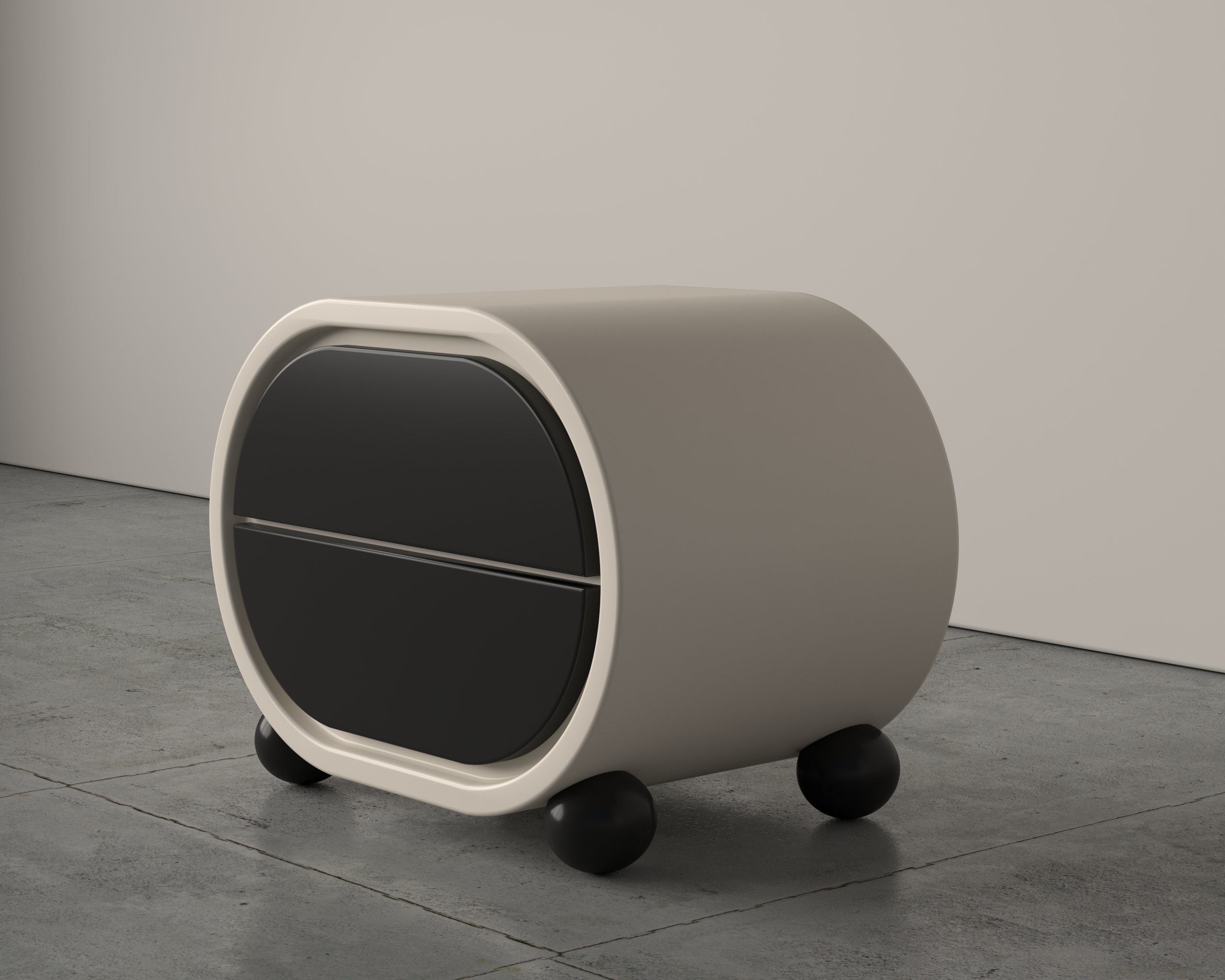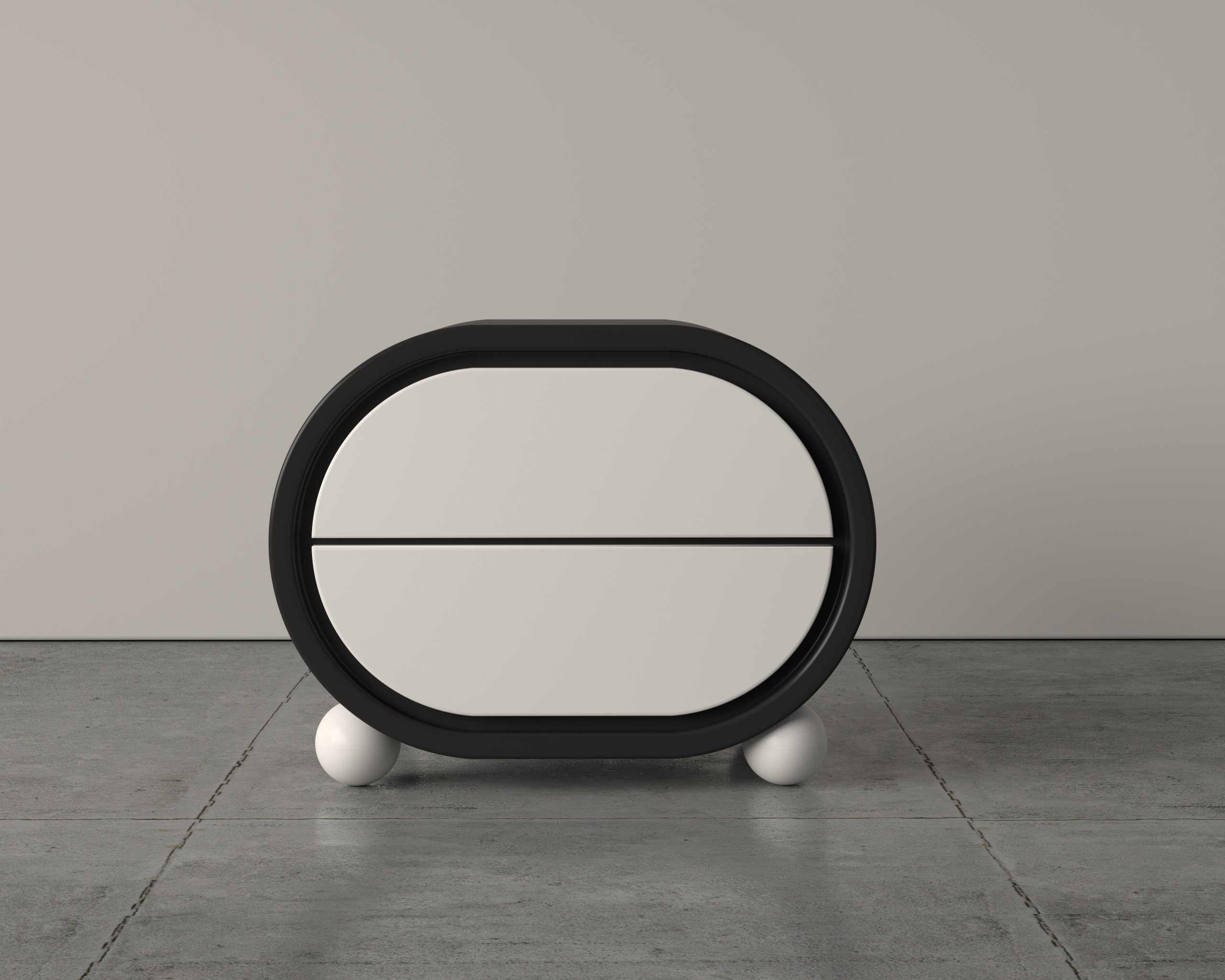Sculptural oval silhouette with smooth contours,Two flush drawers offering a seamless aesthetic,Elegant symmetry with soft-edge detailing,Resting on refined spherical bases for a balanced poise,Contemporary design blending form and function
