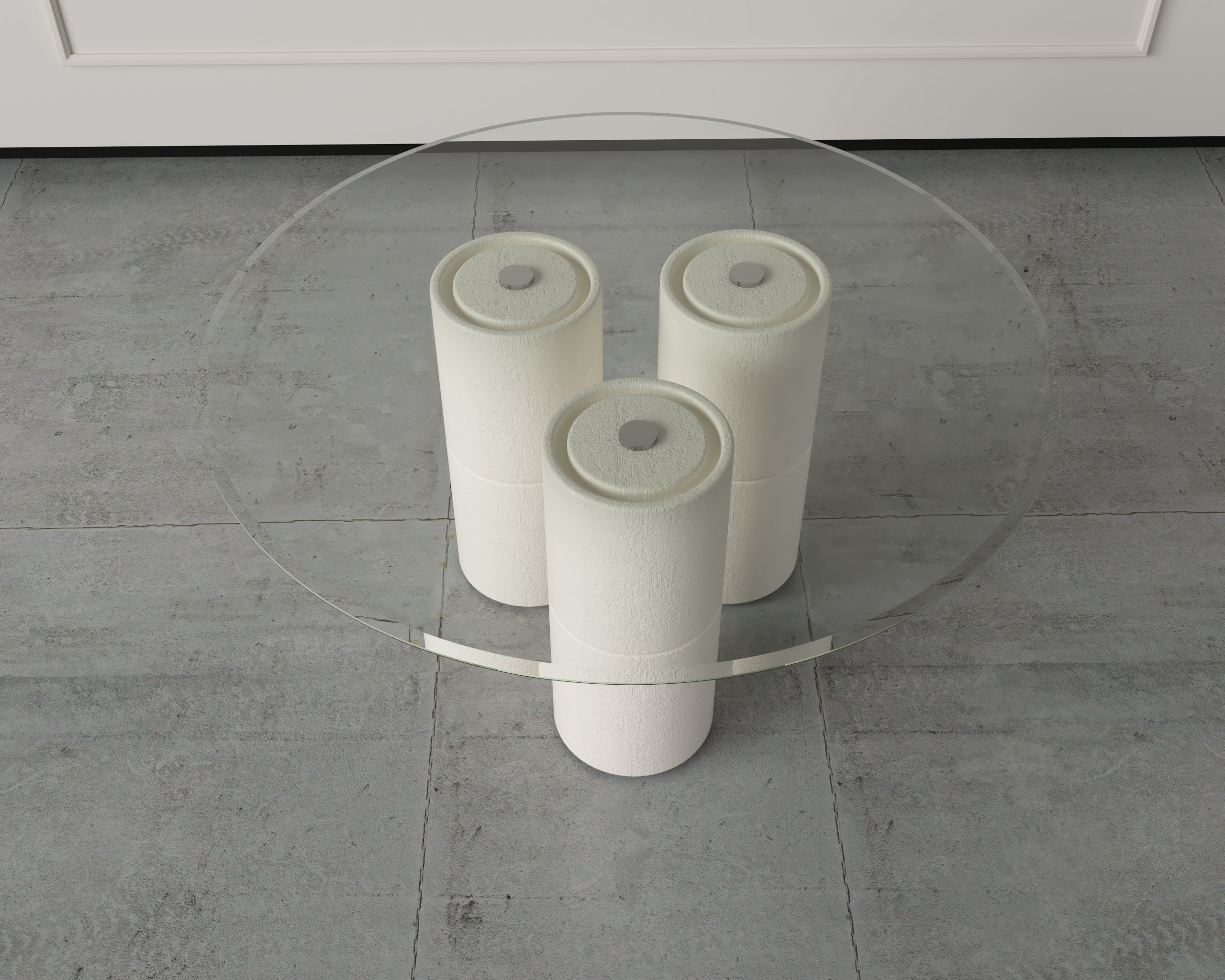 The Zahra Table combines a sculptural cylindrical base with a refined glass top, creating a striking centerpiece for modern interiors.